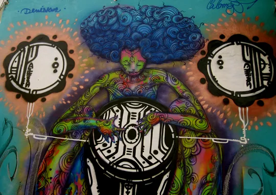Grafiteiro de traços marcantes e de um colorido explosivo, sem igual – Eder Muniz mostra em seus mais recentes trabalhos, composições que mesclam entre desenhos figurativos com um toque místico. Suas talentosas criações às vezes nos revelam seres inimagináveis, além de pássaros, seres humanos e plantas – o seu graffiti torna-se único por tirar partido dessas formas e aceitar intervenções de outros artistas de estilo similar como Denis Sena.